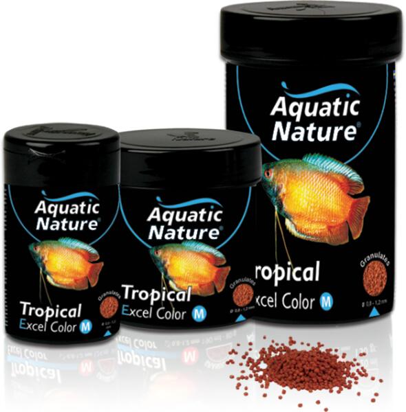 Aquatic Nature Tropical Excel Color M szemcsés díszhaleleség. Teljes értékű haltáp mindenféle trópusi akváriumi díszhal számára. Könnyen emészthető, elősegíti a tökéletes növekedést, testformát és az élénk természetes színeket. Nem szennyezi a vizet. Javasolt kombinálni az Aquatic Nature Tropical Energy Food táppal. Kiszerelése 190 ml / 80 g. Szemcseméret: 0,8-1,2 mm.