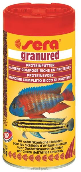 Fehérjében gazdag granulátum táplálék húsevő cichlidák számára. Húsfeldolgozási melléktermékek, garnélaliszt, természetes ásványi anyagok és nyomelemek valamint a karotinban gazdag spirulina-alga teszik a sera granured terméket a pompás díszhalak ideális fő táplálékává.