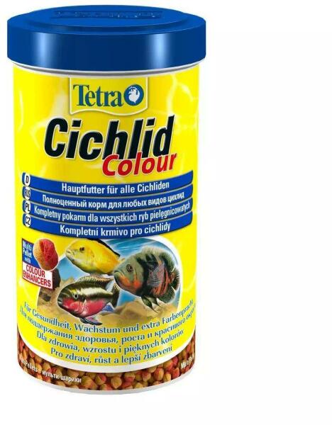Tetra Cichlid Colour 500ml - Termékleírás A Tetra Cichlid Colour Pellets egy teljes értékű színjavító eledel cichlidák számára, amely két pelletméretben kapható. A magas fehérjetartalom támogatja a növekedést, a természetes színfokozókban gazdag Multi Pellet formula pedig fokozza a sárga, narancssárga és vörös trópusi halak színezetét. Összetétel
