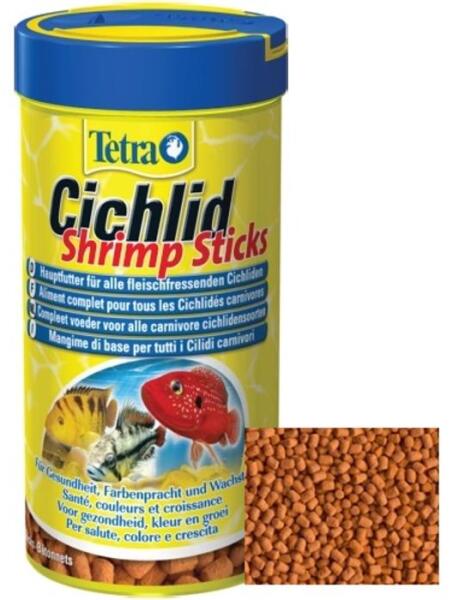 Tetra Cichlid Shrimp Sticks díszhatápA Tetra Cichlid Shrimp Sticks egy kiváló minőségű, teljes értékű fő eleség, amely kifejezetten a ragadozó sügérek egészséges és kiegyensúlyozott táplálására lett kifejlesztve. A pálcikák az ízletes táplálkozás és az intenzív színképződés érdekében 50%-nál magasabb krill- és garnélarák tartalmúak.  Az értékes zsírsavak biztosítják az energiát, így erősödik a halak ellenálló képessége. A kiváló minőségű természetes alapanyagokat tartalmazó, színezőanyagoktól és hozzáadott tartósítószerektől mentes egyedi receptúra, valamint az optimálisan összeállított fehérjekeverék elősegíti az ideális növekedést és a fokozott ellenálló képességet.  Az értékes zsírsavak biztosítják az energiát, így erősödik a halak ellenálló képessége.  A szabadalmaztatott bio-aktív formula elősegíti, hogy a halak egészségesen és sokáig éljenek.  A Tetra Cichlid Shrimp Sticks haltápnak köszönhetően sügérjei szépen fejlődnek, a haltáptól pedig tiszta és áttetsző marad az akvárium vize. Etetési javaslat: