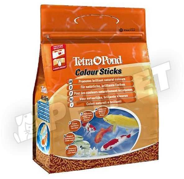TetraPond Colour Sticks - Magas tápértékű, pálcika formájú, víz felszínén úszó haleleség. Kiváló minőségű karotinoid tartalma természetes úton erősíti a halak vörös, narancs és sárga színeit. A színek erősödése már néhány héten belül látható.