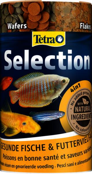 A Tetra Min Flakes a vízfelszínen lebeg, így kiválóan igazodik a vízfelszínen táplálkozó halak – például a Tetrák, ideértve a bárdhalakat és fantomokat, valamint az élő hordozó halak, például a Plattik és a kardfarkúak – természetes evési szokásaihoz. A Tetra Min Crisps lebeg, majd lassan lesüllyed, így ideális táplálék a víz felszínén vagy középső szintjén táplálkozó halak – például a legtöbb razbóra, Dánió és a nagyobb Tetrák, például a fekete Tetra – számára. A harmadik összetevő a Tetra Min Granules granulátum. Ez a középső vízrétegben táplálkozó halak – például kisebb sügérek, tigrissügérek és szivárványhalak – természetes evési szokásaival összhangban lassan lesüllyed. A negyedik rekeszben Tetra Wafer Mix található. Az ostya gyorsan lesüllyed, így ideális táplálék minden vízfenéken táplálkozó hal – például harcsa – etetésére. A Tetra Selection kiváló minőségű összetevőkből készül, és a halak számára szükséges minden alapvető tápanyagot, például vitaminokat, ásványi anyagokat és nyomelemeket tartalmaz. Könnyen fogyasztható összetételüknek és jó emészthetőségüknek köszönhetően mind a négy komponens segít megőrizni az akvárium vizének tisztaságát és stabil állapotát. A Tetra Selection színezőanyagok és hozzáadott tartósítószerek nélkül készül.   Tulajdonságai: