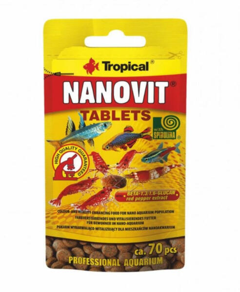 Tropical Nanovit Tablets 10g/70db fehérje tartalmú haltáp apró halaknak. Általános tulajdonságok: Számára - halak Használat - akváriumban Eledel tí...